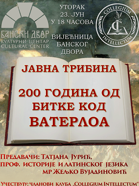 У Вијећници Банског двора 23. јуна 2015. године (уторак) у 19,00 часова биће одржана јавна трибина под називом „200 година од битке код Ватерлоа“ – пад Наполеона.