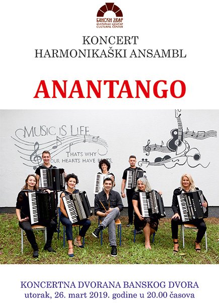 У Концертној дворани Банског двора 26. марта 2019. године (уторак) у 20.00 часова одржаће се концерт aнсамбла хармоника АНАНТАНГО из Зенице.