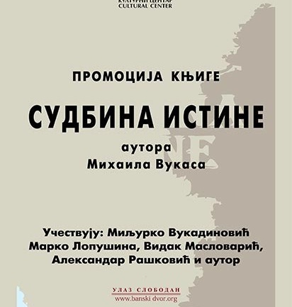 У Вијећници Банског двора 02. септембра 2016. године (петак) у 19,00 часова биће промовисана књига "Судбина истине", аутора Михаила Вукаса,