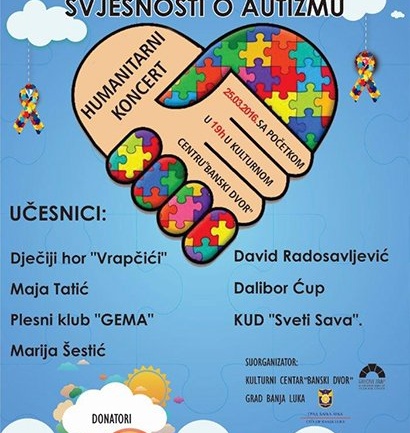 У Концертној дворани Банског двора 25. марта 2016. године (петак) у 19,00 часова биће одржан концерт – „У сусрет Свјетском дану свјесности о аутизму“, Удружење за помоћ лицима  са аутизмом „Дјеца свјетлости“. Програм Музичка тачка члана Удружења Алексе Шукала уз инструменталну и вокалну пратњу (ученици ОШ ,,Милош Црњански'')…