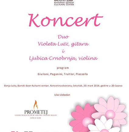 У Концертној дворани Банског двора 20. марта 2014. године (четвртак) у 20,00 часова одржаће се концерт Виолете Лучић, гитара и Љубица Црнобрња, виолина.