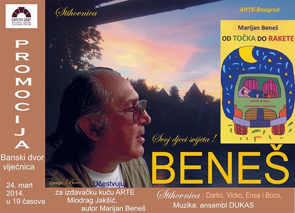 У Вијећници Банског двора 24. марта 2014. године (понедјељак) у 19,00 часова одржаће се промоција збирке поезије"Од точка до ракете", аутора Маријана Бенеша.