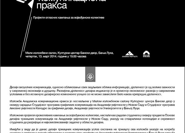 У Малом изложбеном салону Банског двора 13. марта 2014. године у 19,00 часова одржаће се отварање изложбе плаката под називом"Академска комуникациона пракса" у оквиру сарадње Студијског програма графичких комуникација на Академији умјетности у Новом Саду и Студијског програма ликовне умјетности Катедре за графички дизајн, Академије умјетности у Бањој…