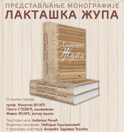 У Вијећници Банског двора 10. октобра 2013. године (четвртак) у 19,00 часова одржаће се промоција монографије „Лакташка Жупа – прошлост и садашњост“ аутора Живка Вујића. Учествују : Милутин Вујић, Панто Стевић, Небојша Куштриновић, Анђелка Рачић и аутор, гост: Ансамбл Здравка Ћосића   *** ПРЕДСТАВЉАЊЕ МОНОГРАФИЈЕ…