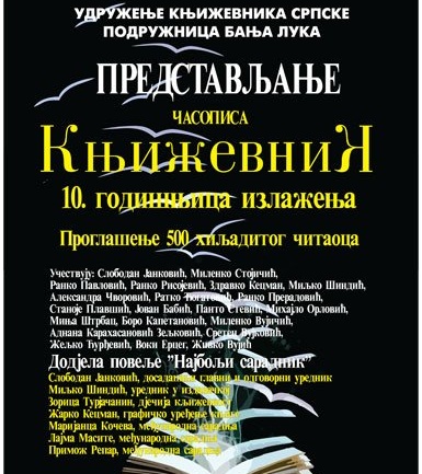 У Вијећници Банског двора 02. октобра 2013. године (сриједа) у 19,00 часова одржаће се 10. годишњица часописа „Књижевник“ и издавачке дјелатности Подружнице Бања Лука Удружења књижевника Републике Српске ,. *** 10. годишњица часописа „Књижевник“ и издавачке дјелатности Подружнице Бања Лука Удружења књижевника Републике…