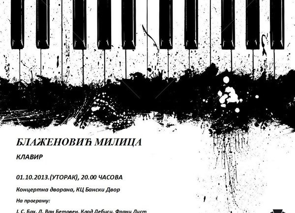 У Концертној дворани Банског двора 01. октобра 2013. године у 20,00 часова одржаће се концерт Милице Блаженовић, клавир, студенткиње IV године Музичке академије у Бањој Луци у класи Владимира Цвијића.   *** ПРОГРАМ: J.S.BACH - T окатаи фуга e-moll BWV 914 L.V.BEETHOVEN - 32 variations c-moll…