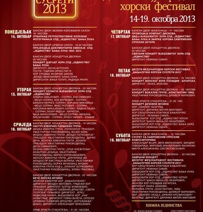 У ПЕРИОДУ ОД 14. ДО 19. ОКТОБРА 2013. ГОДИНЕ ОДРЖАЋЕ СЕ ЦЕНТРАЛНИ ДИО ОБИЉЕЖАВАЊА МАНИФЕСТАЦИЈЕ ЈУБИЛЕЈА, А У СКЛОПУ ОБИЉЕЖАВАЊА НАСТАВИЋЕ СЕ ДЕСЕТИ МЕЂУНАРОДНИ ХОРСКИ ФЕСТИВАЛ. Као дио рођенданског програма 14. октобра у Великом изложбеном салону Банско г двор а биће отворена ретроспективна…