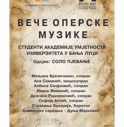 У Вијећници Банског двора 06. јуна 2013. године (четвртак) у 20,00 часова одржаће се Вече оперске музике у извођењу студената соло пјевања Академије умјетности Универзитета у Бањој Луци.     Program: B. Marcello"Il mio bel foco"-Sofija Antic, prva godina A. Scarlatti "Gia il sole dal gange"- Strahinja Buzadžija-prva godina F. Durante…
