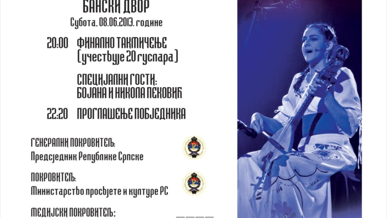 У Концертној дворани Банског двора 08. јуна 2013. године  (субота) у 20,00 часова одржаће се финално вече 20. Фестивала гуслара Републике Српске, у сарадњи са Савезом гуслара Републике Српске.   *** Гусле и историја Гусле су инструмент који се помиње на нашим просторима још у 10 вијеку.…