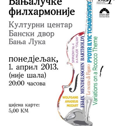 У Концертној дворани Банског двора 01. априла 2013. године (понедјељак) у 20,00 часова одржаће се концерт Симфонијског оркестра Бањалучке филхармоније.