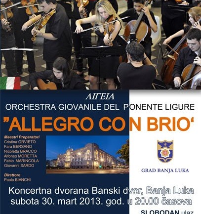 У Концертној дворани Банског двора 30. марта 2013. године (субота) у 20,00 часова одржаће се концерт под називом "Омладински оркестар Источне Лигурије" из Сан Рема.