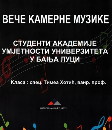 У Вијећници Банског двора 19. марта 2013. године (уторак) у 20,00 часова одржаће се концерт камерне музике у извођењу студената Академије умјетности Универзитета у Бањој Луци, класа: спец. Тимеа Хотић, ванредни професор.