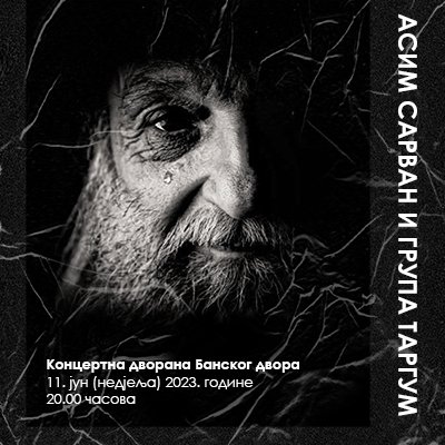 У Концертној дворани Банског двора 11. јуна (недјеља) 2023. године у 20 часова одржаће се ПРОМОТИВНИ КОНЦЕРТ АСИМА САРВАНА И ГРУПЕ "ТАРГУМ" (Поводом најновијег двоструког албума „60е у мом граду“ и „Камен по камен“ ).