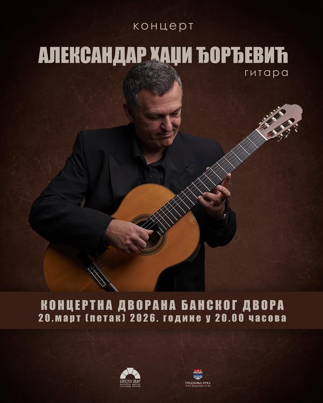У петак, 20. марта 2026. године са почетком у 20.00 часова, публику очекује концерт истакнутог гитаристе Александра Хаџи Ђорђевића, умјетника који је своју богату каријеру градио на домаћим и међународним сценама.