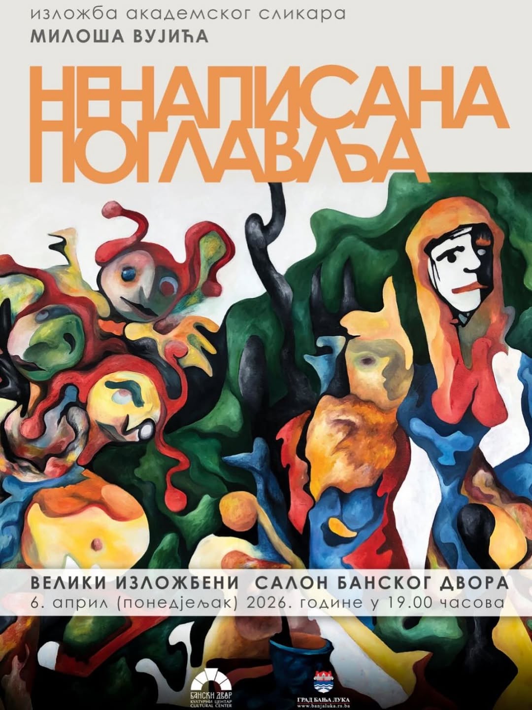 Драга публико, у понедјељак, 6. априла, публика ће имати прилику да присуствује отварању изложбе НЕНАПИСАНА ПОГЛАВЉА, најновијег циклуса слика академског сликара МИЛОША ВУЈИЋА. 🎨🖌️Овај циклус од 30 уља на платну, настајао у периоду од 2020. до 2023. године, представља снажно визуелно свједочанство унутрашњих процеса, гдје…