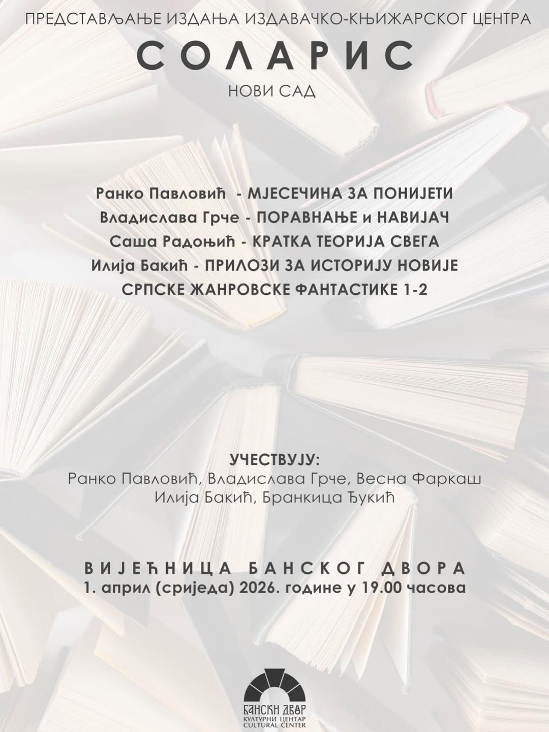 у Вијећници Банског двора 1. априла (сриједа) 2026. године у 19.00 часова ИЗДАВАЧКО - КЊИЖАРСКИ ЦЕНТРА СОЛАРИС из Новог Сада ће представити своја издања.