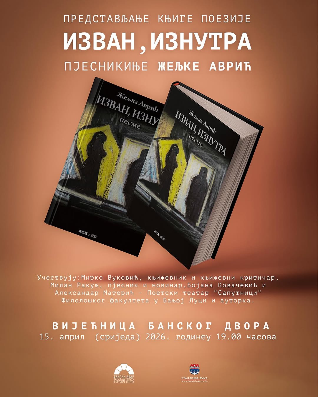 Драга публико, у Вијећници Банског двора, у сриједу, 15. априла 2026. године у 19.00 часова, биће одржано представљање књиге поезије „Изван, изнутра“ ауторке Жељке Аврић. О збирци ће говорити Мирко Вуковић и Милан Ракуљ, док ће у програму учествовати и Бојана Ковачевић и Александар Матерић,…