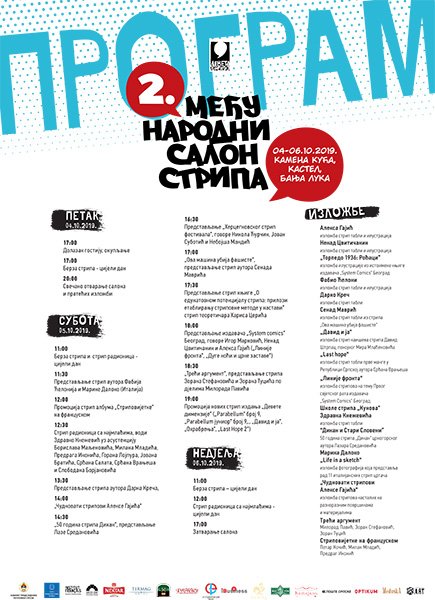 Друго издање Салона стрипа посјетиоцима ће понудити бројне садржаје. Планирана је поставка десет ретроспективних изложби са преко 600 страница стрипа, те промоције бројних стрип издања. Из богатог програма организатори посебно издвајају стрип радионице и стрип школу. Радионице и материјал су бесплатни. Захваљујући помоћи Италијанске амбасаде у БиХ и амбасадору Николи Минасију гости салона су и два аутора из Италије.
