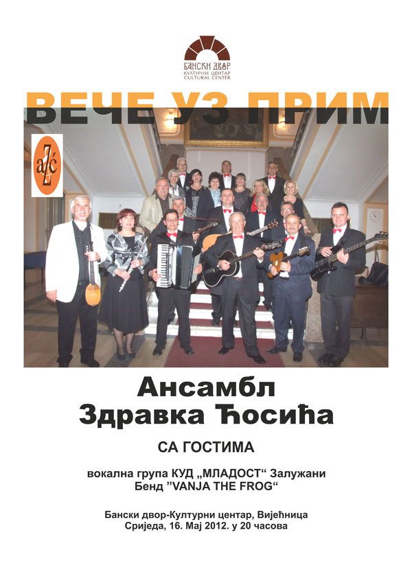 БАНСКИ ДВОР 16.05.2012. године СНИМЦИ ПРЕТХОДНИХ ДОГАЂАЈА14/05/2012 У Вијећници Банског двора 16.05.2012. године у 20,00 часова одржаo се концерт Ансамбла Здравка Ћосића „Вече уз прим“. Вокaлна група КУД „Младост“ Залужани, Бенд „VANJA THE FROG“ Фотографије и снимак са концерта http://youtu.be/2GfkAI63iI0