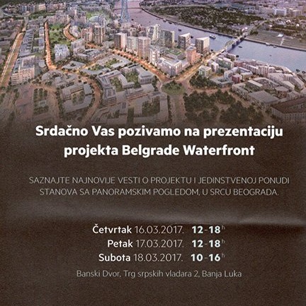 У Црвеном салону Банског двора од 16. до 18. марта 2017. године одржаће се презентација пројекта Belgrade Waterfront,