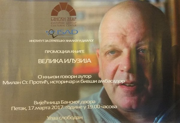 У Вијећници Банског двора 17. марта 2017. године (петак) у 19,00 часова биће промовисана књига “Велика илузија“, аутора Милана Ст.Протића,