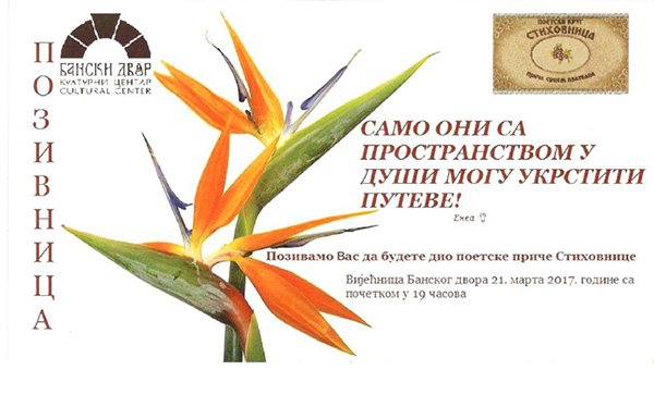 У Вијећници Банског двора 21. марта 2017. године (уторак) у 19,00 часова биће обиљежен Свјетски дан поезије,