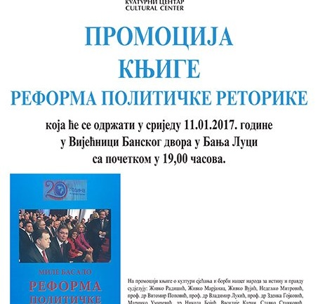 У Вијећници Банског двора 11. јануара 2017. године (сриједа) у 19,00 часова одржаће се промоција књиге „Реформа политичке реторике“, аутора Миле Басала, Учествују: Живко Радишић, Витомир Поповић, Љубинка Драгојевић, Живко Вујић и аутор. Истакнути социјалиста Миле Басало промовисаће 11.01.2017. у Банском двору своју књигу "Реформа политичке реторике",…