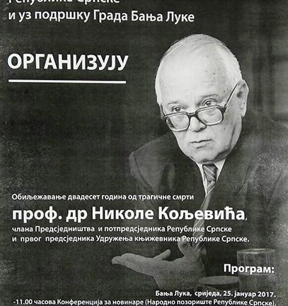 У Вијећници Банског двора 25. јануара 2017. године (сриједа) у 18,00 часова одржаће се Академија посвећена Николи Кољевићу, (Обиљежавање двадесет година од трагичне смрти проф. др Николе Кољевића, члана Предсједништва и потпредсједника Републике Српске и првог предсједника Удружења књижевника Републике Српске).