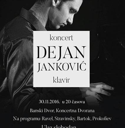 У Концертној дворани Банског двора 30. новембра 2016. године (сриједа) у 20,00 часова одржаће се концерт - Дејан Јанковић, клавир,