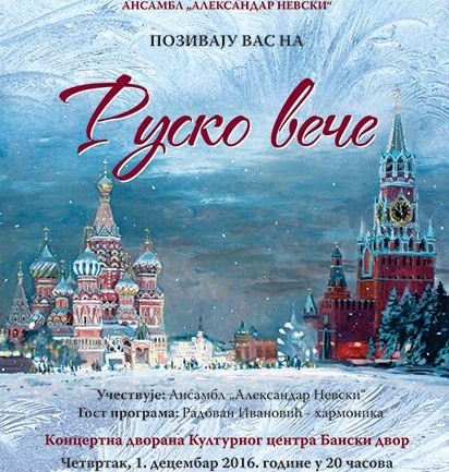 У Концертној дворани Банског двора 01. децембра 2016. године (четвртак) у 20,00 часова одржаће се годишњи концерт Ансамбла „Александар Невски“,