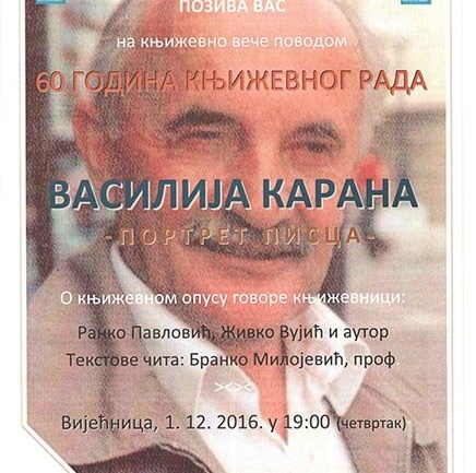 У Вијећници Банског двора 01. децембра 2016. године (четвртак) у 19,00 часова одржаће се књижевно вече - Шездесет година књижевног рада – Портрет Василија Карана,