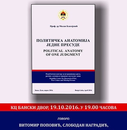 У Вијећници Банског двора 19. октобра 2016. године (сриједа) у 19,00 часова одржаће се промоција књиге „Политичка анатомија једне пресуде“, Аутор: Милан Благојевић, Учествују: Витомир Поповић, Слободан Наградић, Милорад Којић, Жељко Вукадиновић и аутор, Књига представља вриједно научно остварење у процесу сагледавања правног и историјског контекста настанка и…