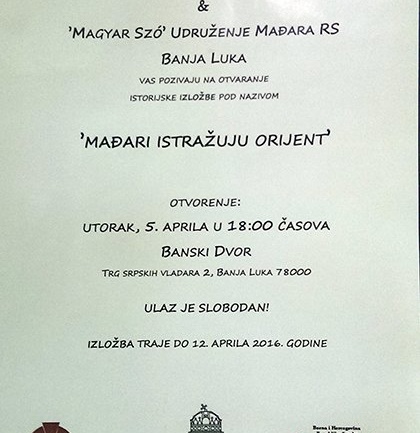 У Малом изложбеном салону Банског двора 05. априла 2016. године (уторак) у 18,00 часова биће отворена roll-up изложба "Мађари истражују Оријент“.