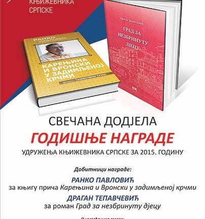 У Вијећници Банског двора 05. априла 2016. године (уторак) у 19,00 часова биће додјељена Годишња књижевне награде за најбољу књигу у 2015. години, Удружења књижевника Републике Српске, коју ове године равноправно дијеле Ранко Павловић за књигу прича "Карењина и Вронски у задимљеној крчми" и Драган…
