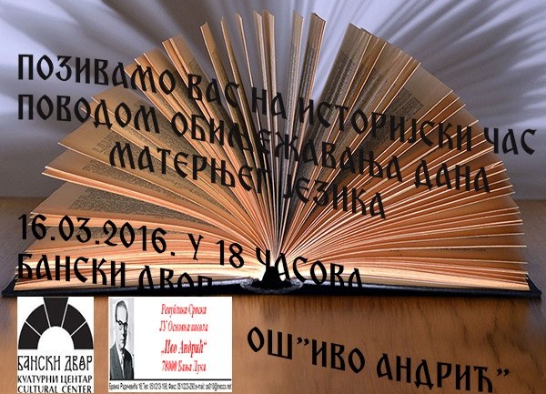 У Вијећници Банског двора 16. марта 2016. године (сриједа) у 19,00 часова оджаће се историјски час под називом "Дан матерњег језика",