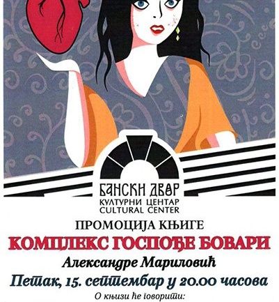 У Вијећници Банског двора 15. септембра 2017. године (петак) у 20.00 часова одржаће се промоција књиге „Комплекс госпође Бовари“, аутора Александрe Мариловић. Учествују: Душко Певуља, Милан Ракуљ, Горан Гаврић Грга и аутор. Гост: Драгана Латиновић – клавир. КОМПЛЕКС ГОСПОЂЕ БОВАРИ       Роман „Комплекс гђе Бовари“  поставља питање да…