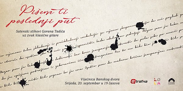 У Вијећници Банског двора 20. септембра 2017. године (сриједа) у 19.00 часова одржаће се поетско вече "Пишем ти последњи пут", Горана Тадића. У сарадњи са Удружењем грађана Еtrafika.net и магазином Лола. „Пишем ти последњи пут“ назив је поетске вечери којом ће пјесник из Новог Сада Горан…