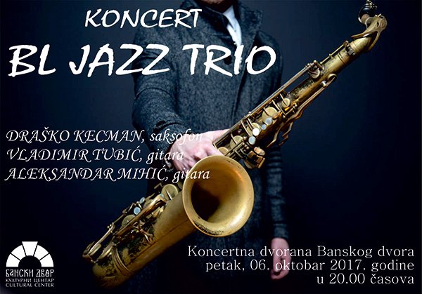 У петак 06. октобра 2017. године одржаће се концерт џез састава BL JAZZ TRIO кога чине бањалучки џез музичари Драшко Кецман (саксофон), Владимир Тубић (гитара) и Александар Михић (гитара). Концерт ће се одржати у Концертној дворани Банског двора са почетком од 20.00 часова. БЕСПЛАТНЕ ПОЗИВНИЦЕ за концерт…