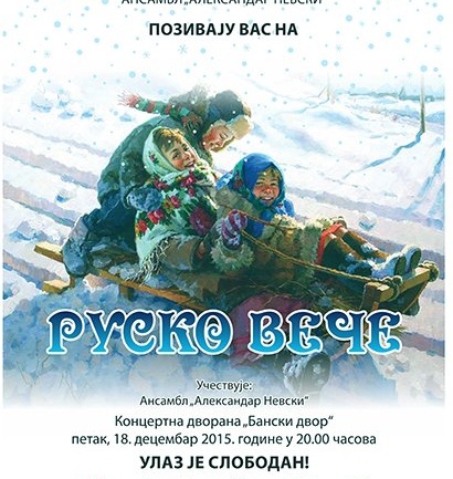 У Концертној дворани Банског двора 18. децембра 2015. године (петак) у 20,00 часова одржаће се Годишњи концерт хора „Александар Невски“.                           ПРОГРАМ: Покрајчић - «ВЈЕЧНАЈА ПАМЈАТ» ( Помен жртвама међународних терористичких напада) Алфееев – «ХЕРУВИМСКА ПЈЕСМА» Корнелюк - «ГОРОД, КОТОРОГО НЕТ» *** «ЭХ ДА ЗАПОЁМ» Попурри на темы русских народных…