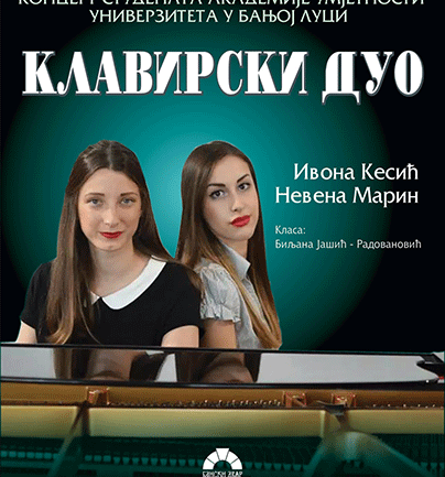 У Вијећници Банског двора 08. децембра 2014. године (понедељак) у 20,00 часова одржаће се концерт студената Академије умјетности Универзитета у Бањој Луци, Ивона Кесић - клавир, Невена Марин - клавир, Класа: Биљана Јашић-Радовановић. * * *                                                           ПРОГРАМ     Р. Шумана:  Слике са истока op. 66 Lebhaft Nicht schnell und sehr gesangvoll…