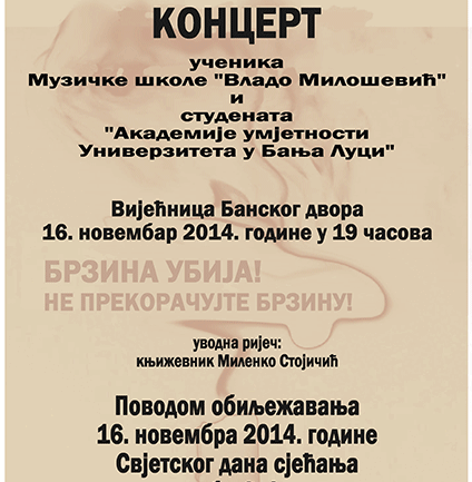 У Вијећници Банског двора 16. новембра 2014. године (недјеља) у 19,00 часова биће одржан концерт поводом "Међународног дана сјећања на жртве настрадале у саобраћају".