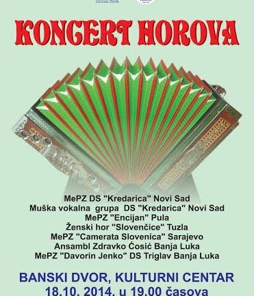 У Концертној дворани Банског двора 18. октобра 2014. године (субота) у 19,00 часова биће одржан концерт- „Ревија словеначких хорова из Босне и Херцеговине, Србије и Хрватске“. Учествују хорови из поменутих земаља, у сарадњи са Удружењем Словенаца Републике Српске. Концерт “Ревија словеначких хорова из Србије, Хрватске и Босне и…