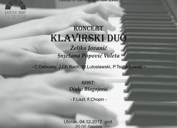 У Концертној дворани Банског двора 04. децембра 2012. године (уторак) у 20,00 часова одржаће се концерт Сњежане Поповић Вулета, клавир и Жељке Јованић, клавир.