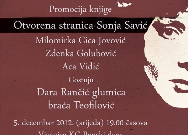У Вијећници Банског двора 05. децембра 2012. године (сриједа) у 19,00 часова одржаће се промоција књиге - пројекат "Соња Савић - отворена страница".