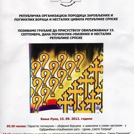 У Вијећници Банског двора 15. септембра 2012. године (субота) у 13,30 часова одржаће се јавна трибина на тему "Процес тражења несталих-реформа Института за нестала лица БиХ и процесуирање ратних злочина-структурални дијалог" и представљање списка несталих и осуђених у Хашком трибуналу и суду БиХ РЕПУБЛИЧКА ОРГАНИЗАЦИЈА ПОРОДИЦА…