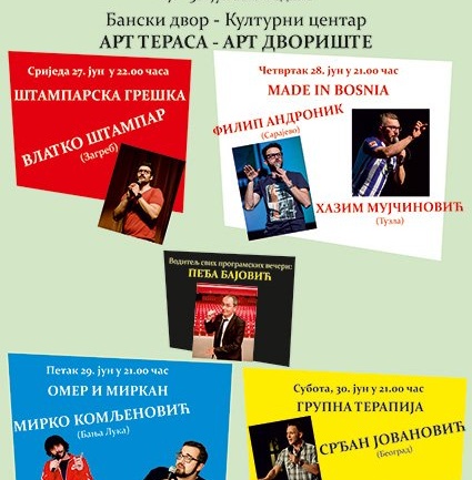 У Банском двору - Културном центру од 27. до 30. јуна 2018. године одржаће се први "БАЊА ЛУКА СТЕНД АП ФЕСТИВАЛ". ПРОГРАМ ФЕСТИВАЛА: - сриједа 27. јуна 2018. године у 22.00 часа на Арт тераси Банског двора наступа ВЛАТКО ШТАМПАР (Загреб) - "ШТАМПАРСКА ГРЕШКА" - четвртак 28. јун…