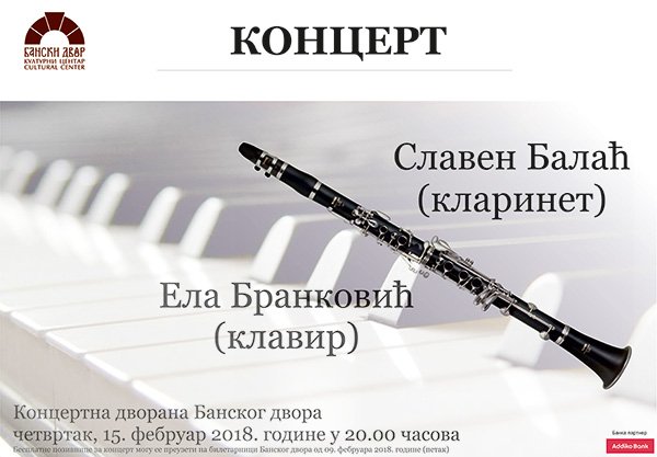 У Концертној дворани Банског двора 15. фебруара 2018. године (четвртак) у 20.00 часова одржаће се концерт Славен Балаћ (кларинет) и Ела Банковић (клавир).