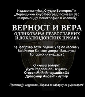 У Вијећници Банског двора 14. фебруара (петак) 2020. године у 19:00 часова одржаће се промоција књиге „Верност и вера“  аутора Драгомира Ацовића, док ће у исто вријеме у Малом изложбеном салону бити отворена изложба „Одликовања православних и дохалкидонских цркава“, такође аутора Драгомира Ацовића. Догађај организује Издавачка…