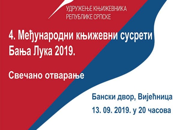 У Вијећници Банског двора 13. септембра (петак) у 20 часова биће отворени 4. Међународни књижевни сусрети у организацији Удружења књижевика Републике Српске. Сусрети ће бити затворени 17. септембра (уторак) 2019. године.