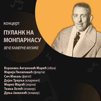 У Концертној дворани Банског двора 3. априла ( понедјељак) 2023. године у 20.00 часова одржаће се концерт ПУЛАНК НА МОНПАРНАСУ - ВЕЧЕ КАМЕРНЕ МУЗИКЕ. Публици ће се представити  Вероника Антуновић Марић (обоа), Марија Пилиповић (флаута), Сич Михаљ (фагот), Дејан Тркуља (кларинет), Милан Стојановић (хорна),Тимеа Хотић (клавир) и Дуња Јанковић (клавир). Ово је…